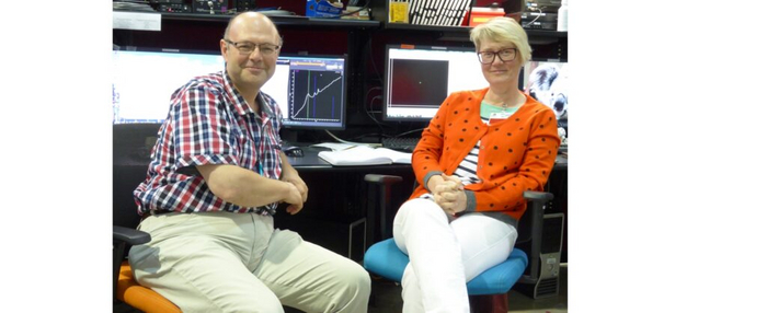 Профессора Леонид и Наталья Дубовинские в байройтском университете. На заднем плане – монитор, демонстрирующий достижение давления более 10 миллионов атмосфер на небольших участках алмаза в одной из тестовых двухступенчатых алмазных наковален / ©phys.org