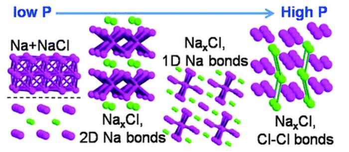 При еще более высоких давлениях, начиная с нескольких миллионов атмосфер, химические свойства элементов, определяющие состав их соединений в обычных условиях, уступают дорогу только одному стремлению — упаковать оказавшиеся под давлением атомы как можно плотнее. В привычной среде натрий может соединяться только с одним атомом хлора, образуя каменную соль NaCl, а при миллионах атмосфер это железное правило из школьных учебников химии существенно размягчается — и образуются немыслимые соединения NaCl3 и Na3Cl.