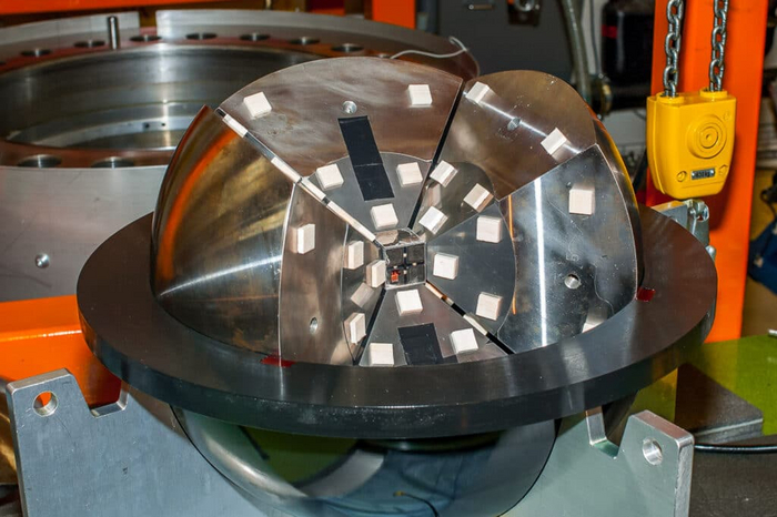Сдавливающий аппарат двухступенчатого пресса. Образец помещается между маленькими кубами из сверхтвердого материала в центре изображения / ©highpressure.ethz.ch