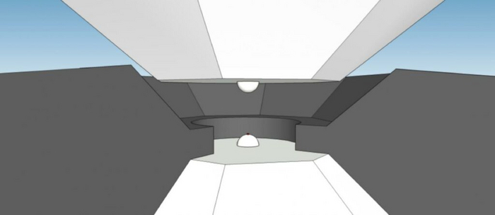 Двухступенчатая ячейка с алмазными наковальнями, использовавшаяся для демонстрации устойчивости кристаллической структуры осмия при 7,7 миллионах атмосфер. Серым цветом показан рениевый уплотнитель. Образец – маленькая красная точка на вершине полусферы из нанокристаллического алмаза. / © Elena Bykova/University of Bayreuth