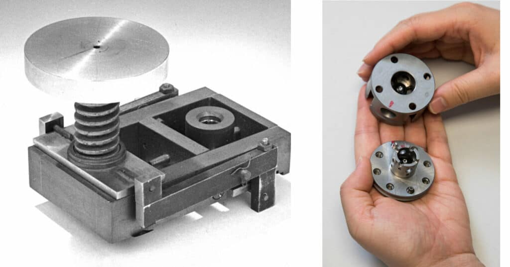 Первая изготовленная ячейка с алмазными наковальнями и современная компактная ячейка (разобранная) / © wikipedia.org / Dawn Harmer/SLAC National Accelerator Laboratory