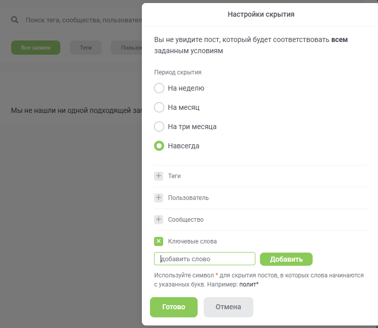 Я не про теги говорю, а про ключевые слова. То есть вы можете добавить часть приписки автора, и с этой припиской вы посты видеть перестанете. Попробуйте поэкспериментировать со связками.