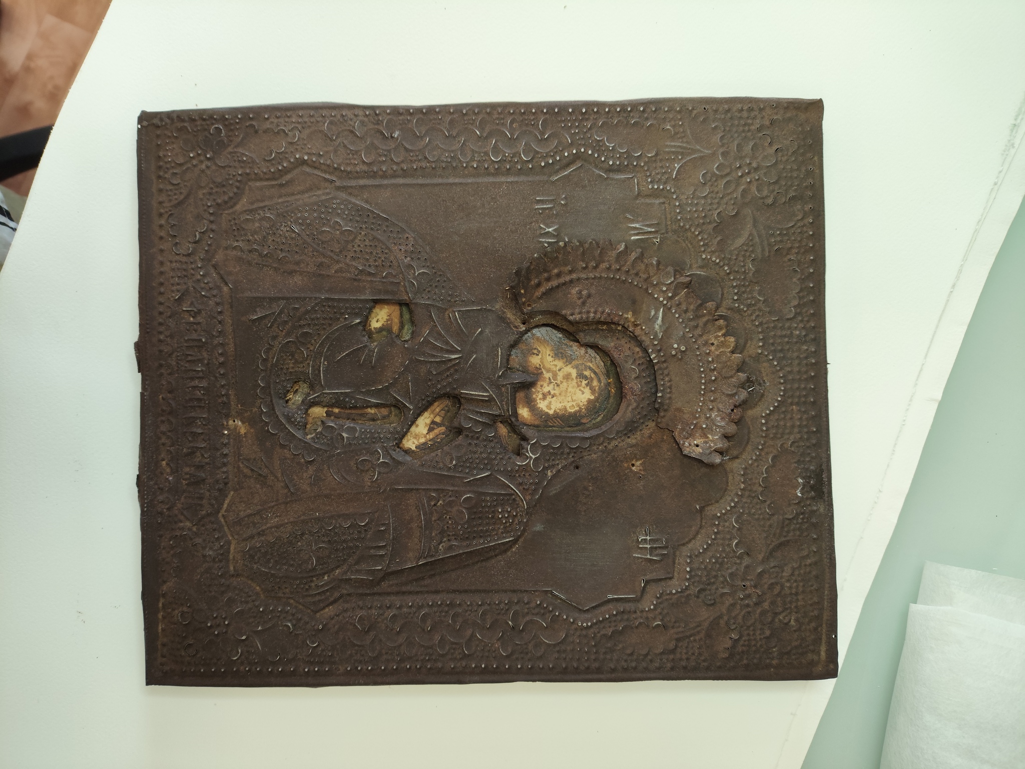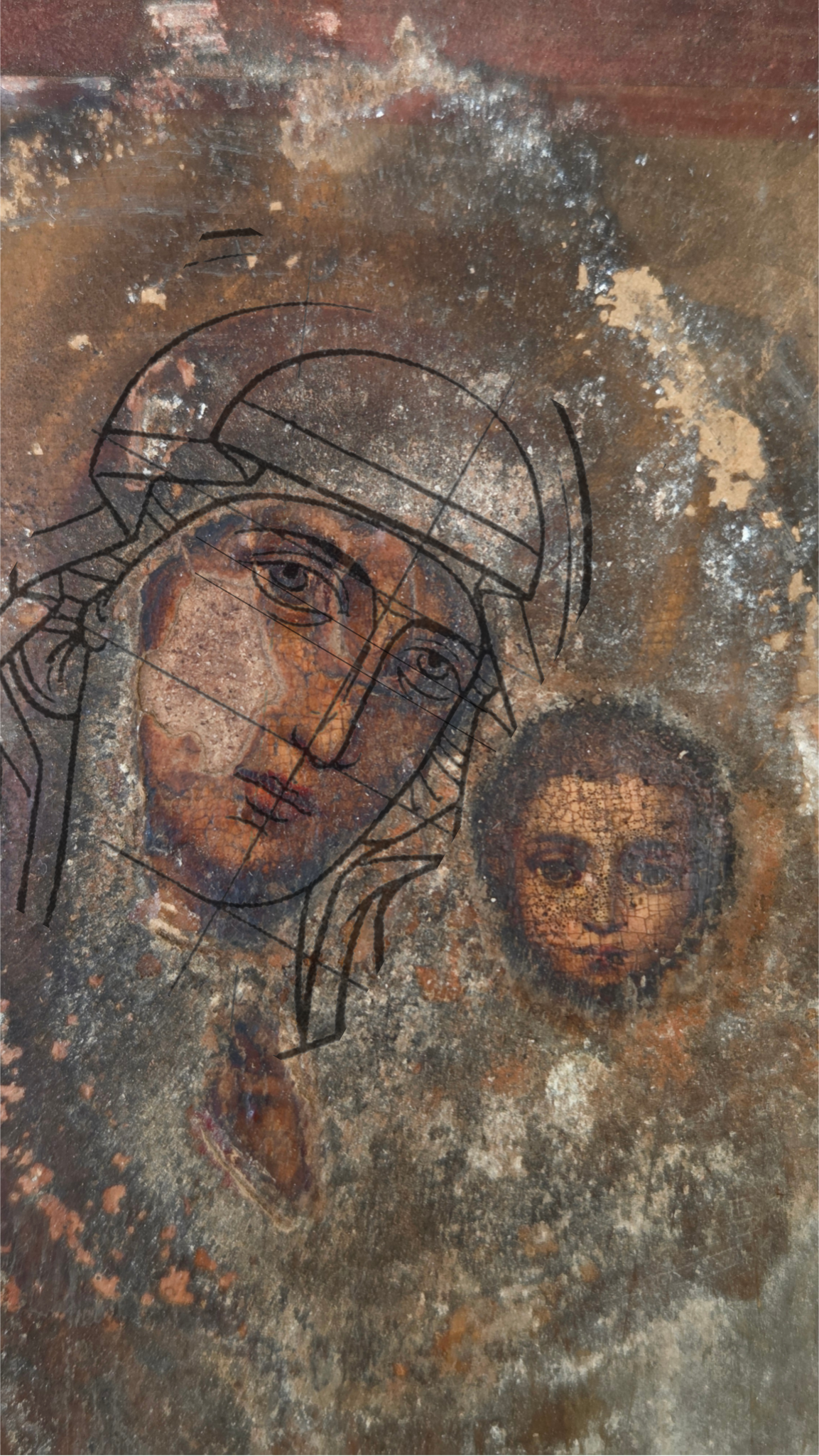 Этой иконы почти не существовало, лишь слой праха под грязью и почерневшим лаком. Бумажная основа была в ужасном состоянии, а на щеке Богородицы зияла дыра.