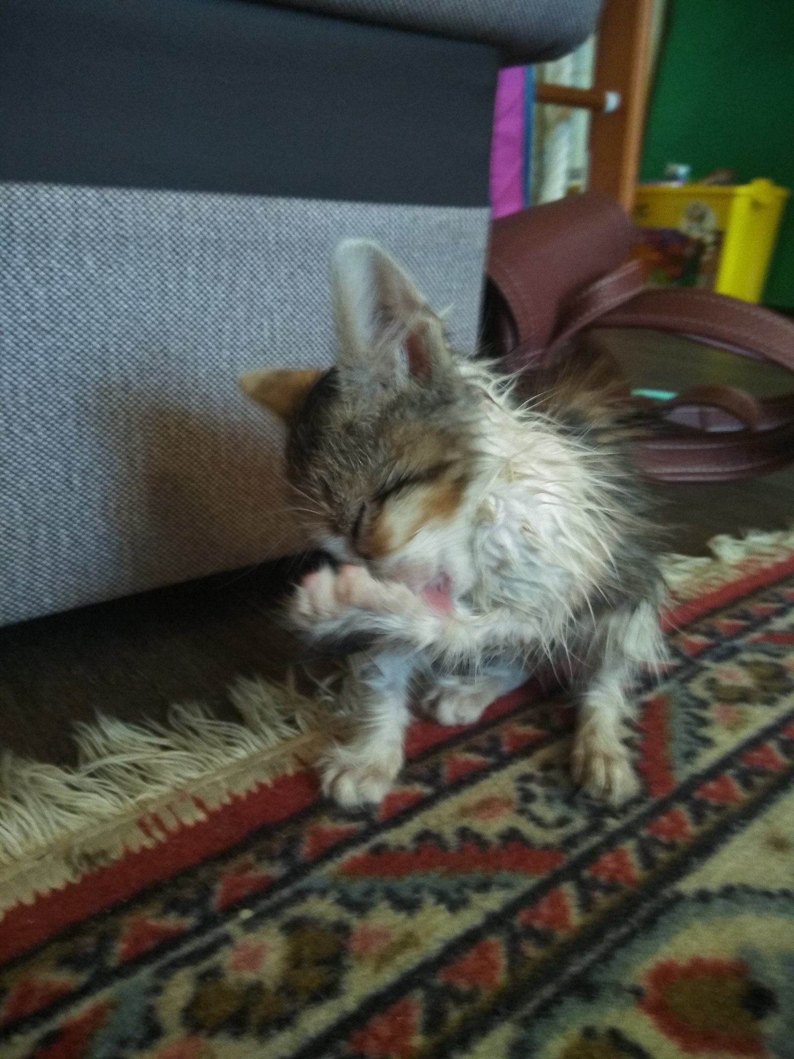 Тут он после первого купания (с первого раза он в белого не превратился). Хвостик и сейчас не зарастает на месте травмы.