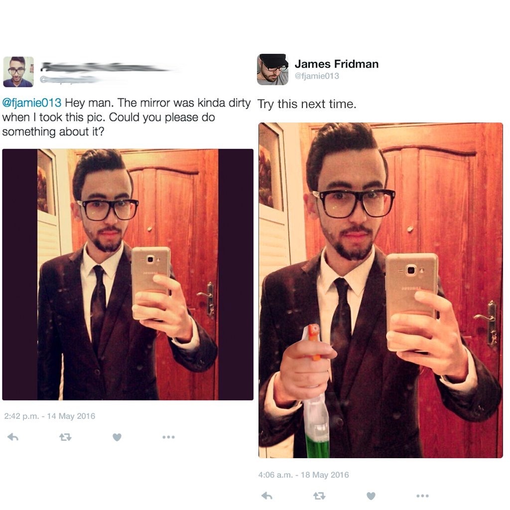 – Привет, старина! Когда я делал этот снимок, зеркало было грязноватым. Не мог бы ты сделать с этим что-то?