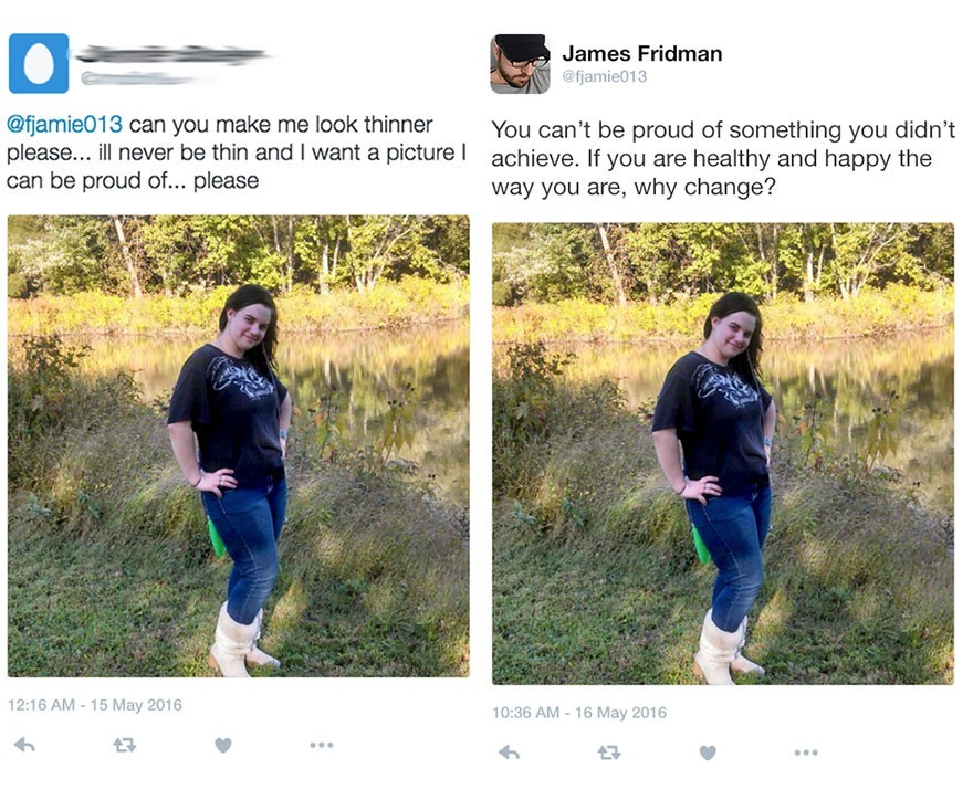 – тот парень отфотожабил меня, и это выглядит довольно странновато, не мог бы ты убрать его? Спс