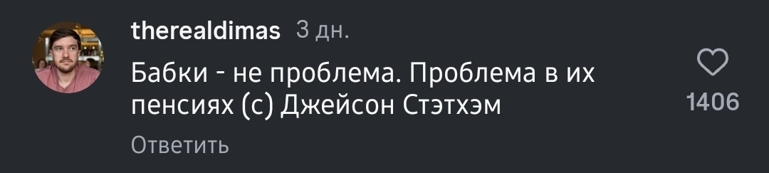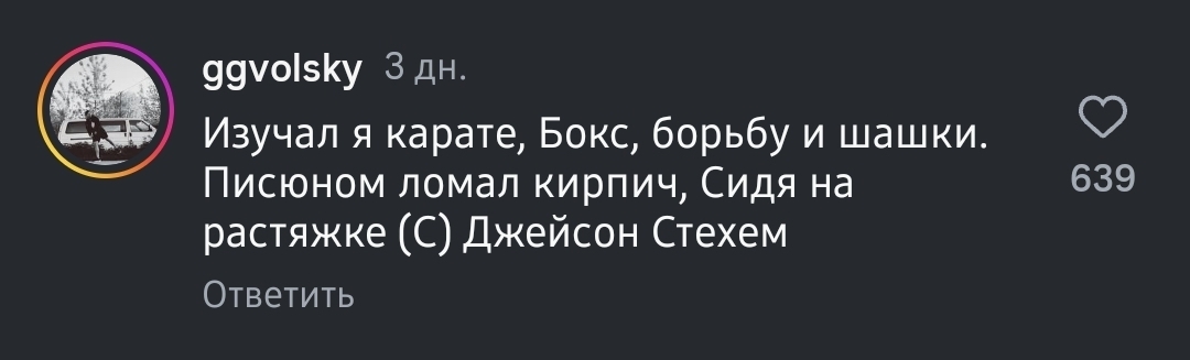 59 tematkachenko Специфический юмор Юмор Джейсон Стэтхэм. Цитаты 8 месяцев назад Только ради этих цитат, русскоязычных поклонников в комментах, можно подписаться на Джейсона Ссыль Джейсон Стейтем Цитаты Скриншот Instagram Юмор Длиннопост Instagram (ссылка) Мат 1 1 Ещё 0