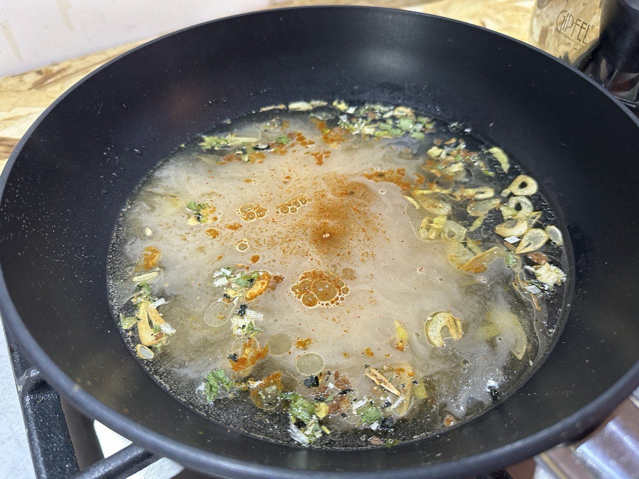На смеси подсолнечного и кунжутного масла обжариваем чеснок и имбирь. Важно чеснок и имбирь ложить в холодное масло и постепенно нагревать. Что бы чеснок сразу не сгорел