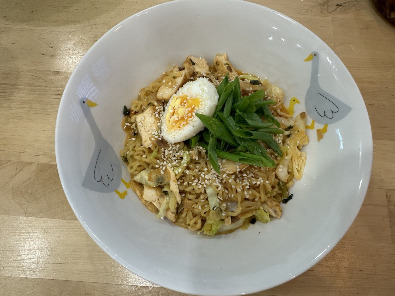 По прошествии этого времени, лапшу перемешиваем, добавляем пластинку плавленого сыра, нарезаную молодую капусту и по желанию какое ни будь мясо, у меня это куриная грудка со вчерашнего ужина.