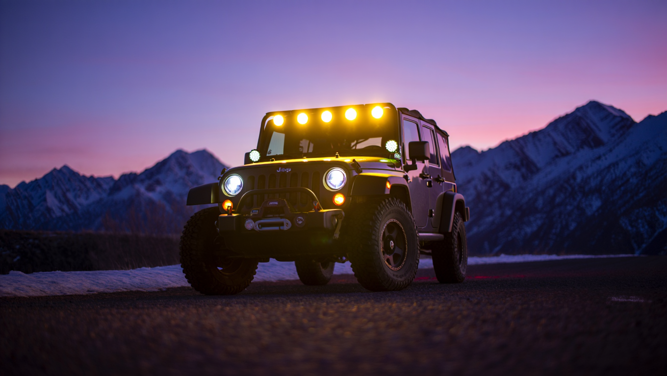 Промпт: A modified black Jeep Wrangler positioned on a mountain trail at dusk, photographed in a wide shot from a low angle. The vehicle is equipped with five amber roof-mounted auxiliary lights, LED headlights, oversized all-terrain tires, and a front winch. The dramatic mountain landscape features snow-covered peaks silhouetted against a purple and pink twilight sky. Natural backlighting creates a cinematic atmosphere while the vehicle's illuminated lights provide warm contrast against the cool evening colors.