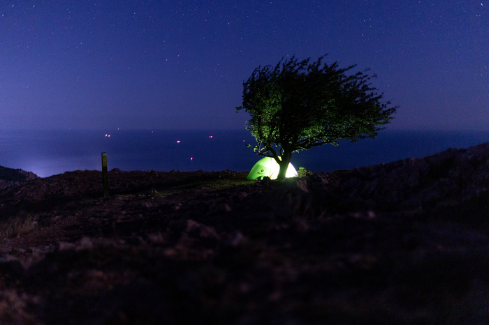 Много туристов решили переночевать на Ильяс-Кая в этот раз, и место возле храма Ильи с углублением было занято, поэтом палатку я поставил возле яблони, удивительно как это дерево вообще тут выросло, ведь дуют тут сильнейшие ветра. Однако у него я даже сумел воткнуть колышки от палатки, и ночью, сколько ветер не пытался, так и не смог сдуть меня в пропасть. Но нужно сказать, что рядом с деревом полно земли. Несмотря на тент, и сетку скальная пыль и земля проникала в палатку довольно заметно, с утра я вытряхивал ее.