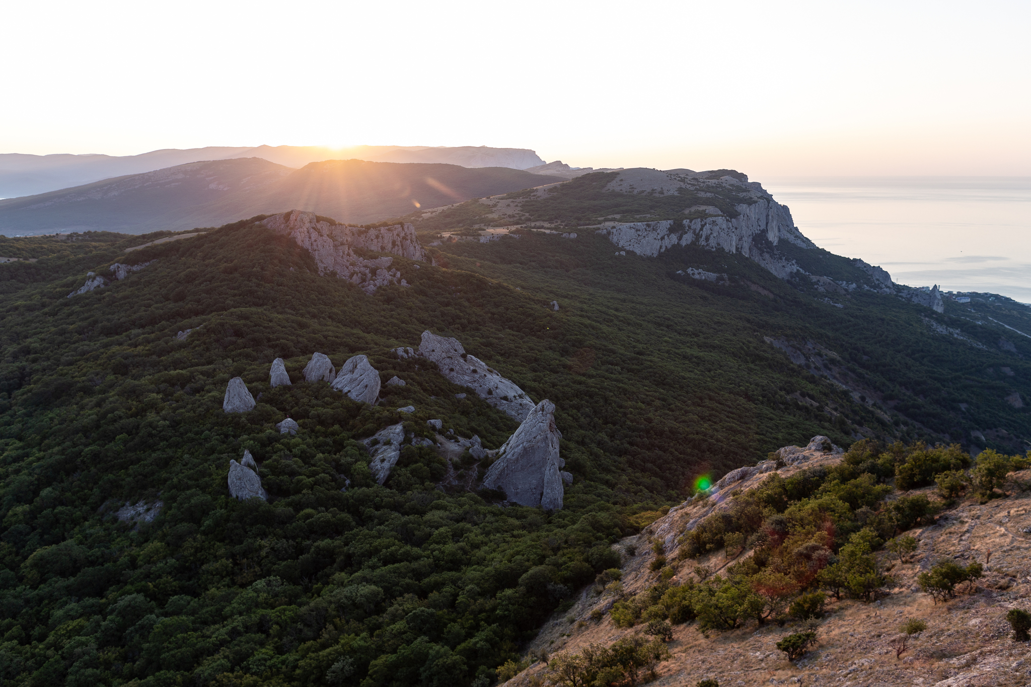 На этот раз я прошелся одним из любимых своих маршрутов к Храму Солнца из Фороса, через церковь Воскресения Христова. Минуя Байдарский перевал, через гору Форос, пройдя над каменным хаосом, вышел к солнечному храму и уже на закате поднялся на Ильяс-Кая, где встретил небольшое трио горных козлов, переночевал под сильнейшим ветром и утром встретил удивительный красоты рассвет.