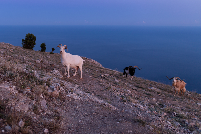 Уже взбираясь на Ильяс-Кая я понимаю, что опоздал на последние лучи солнышка уходящего за Куш-Кая буквально на 20 минут. И закат уже наблюдал в сумерках. Впрочем, был я тут много раз и цели все же своей достиг - это запечатлеть горных коз в их месте обитания на горе Ильяс-Кая. На фотографии вы видите этих красавцев, двух самцов с красивыми и большими рогами и козочку. Животные довольно пугливы, вышли на вершину, как и я проводить рассвет и конечно пощипать травку.