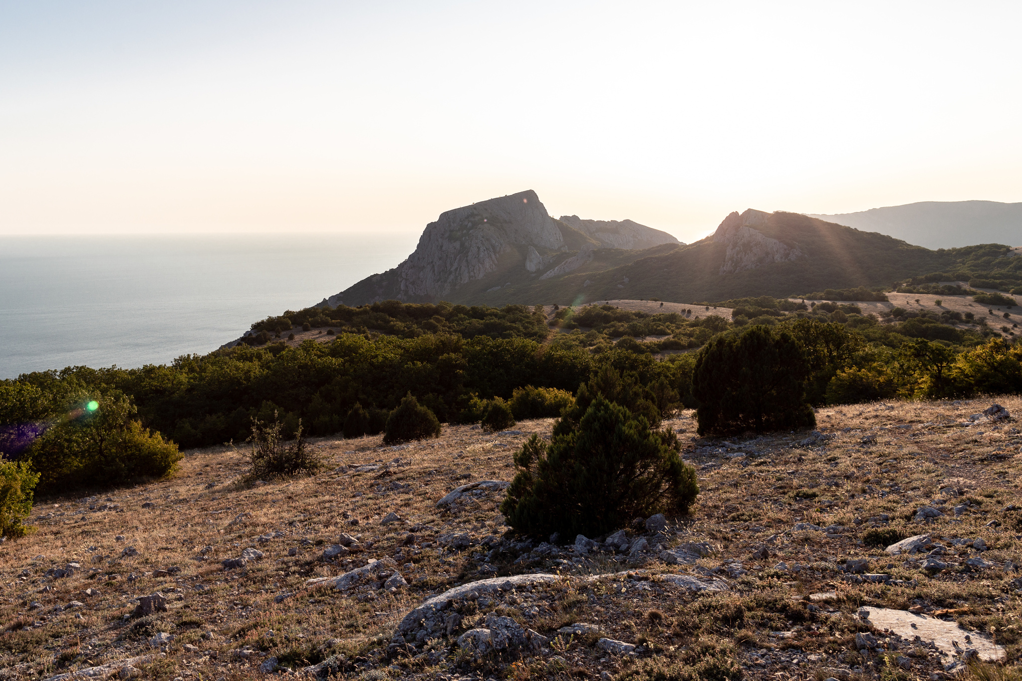 Постепенно мы все же возвращаемся к тропе, и нам открывается вид в закатных лучах на сам "Храм Солнца", но его лучше с этой стороны рассматривать на рассвете. Гора Ильяс-Кая в этом случае предстает нам в виде своеобразного утюжка. Именно на ней я проведу свою ночь, добраться до нее моя основная цель путешествия.