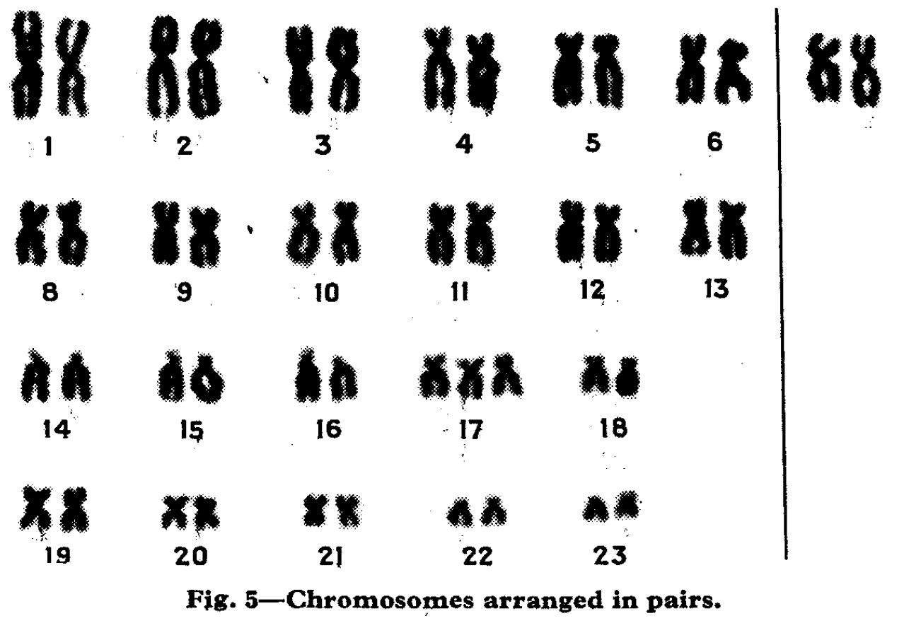 Иллюстрация кариотипа больной девочки из первой публикации Джона Эдвардса. Лишняя хромосома по ошибке опрделена 17, а не 18