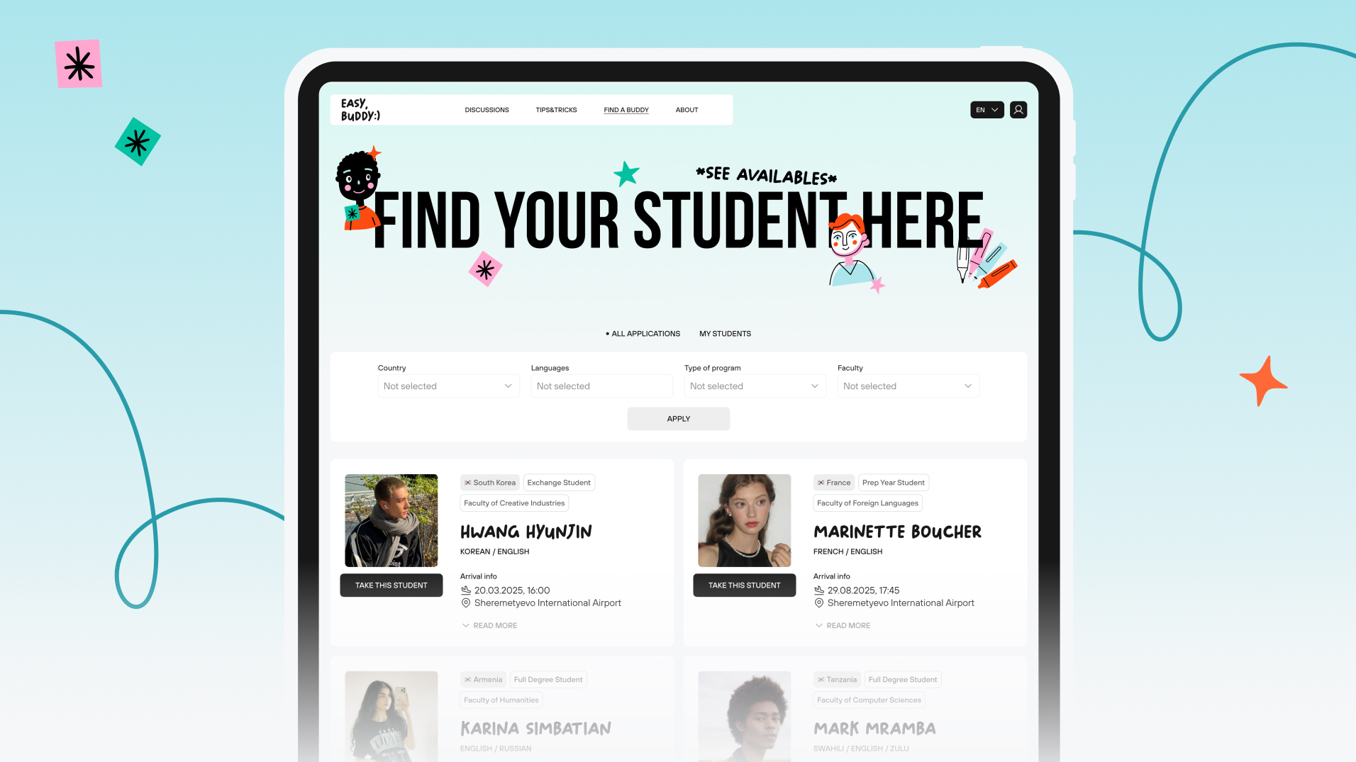 Я сама провела в программе бадди больше года, встречала ребят из Азии и Африки в аэропорту, помогала им влиться в студенческий ритм и даже подружилась с ними — общаемся и сейчас. Так что идею Easy, Buddy:) подсказала сама жизнь: собрать все важное в одном месте, чтобы поддержать иностранцев в России не сухой памяткой, а дружеским, простыми словами и удобным способом найти своего бадди.
