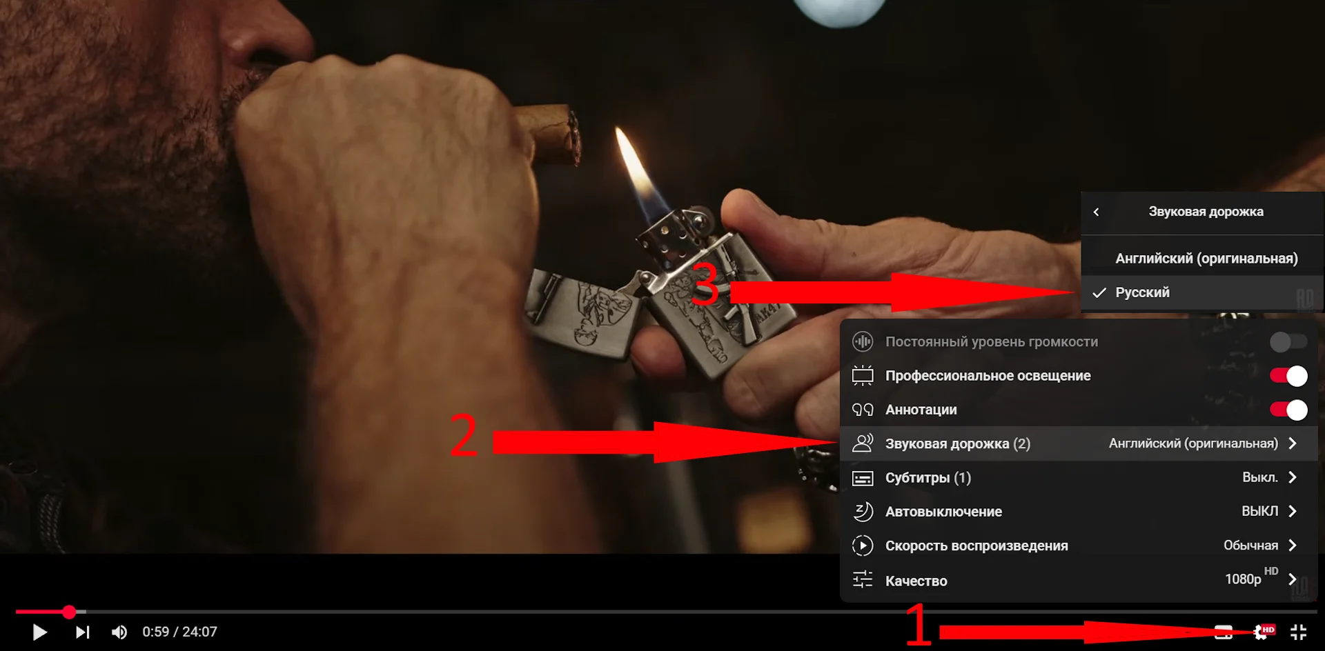 Фильм имеет два языка дубляжа. Чтобы переключить язык на Русский, смотрите скриншот ниже.