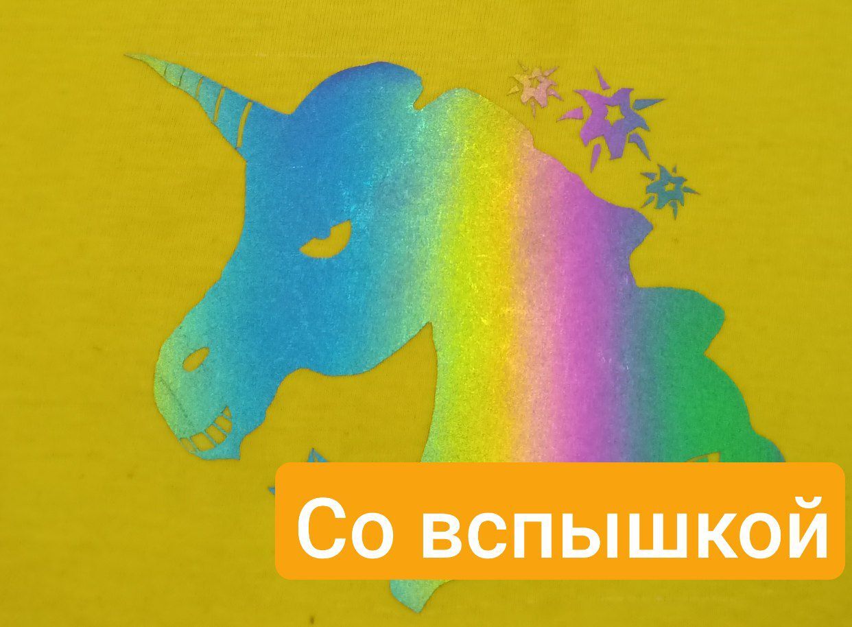 Ребенок захотел футболку с единорогом и со звёздами, нарисовал эскиз и принес папе. Папа добрый, папа доработал детский рисунок и вырезал его из светоотражающей термотрансферной бумаги. Я нашла подходящую футболку и с помощью утюга прикрыла этим единорогом пятно.
