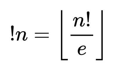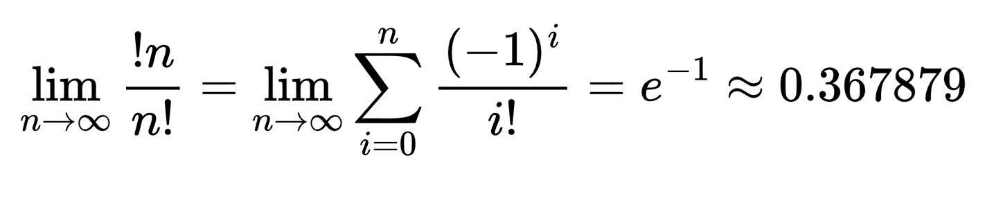 Эта величина - предел вероятности того, что выбранная во множестве перестановка является полным беспорядком. А еще можно увидеть, что !n является ближайшим целым числом к n!/e: