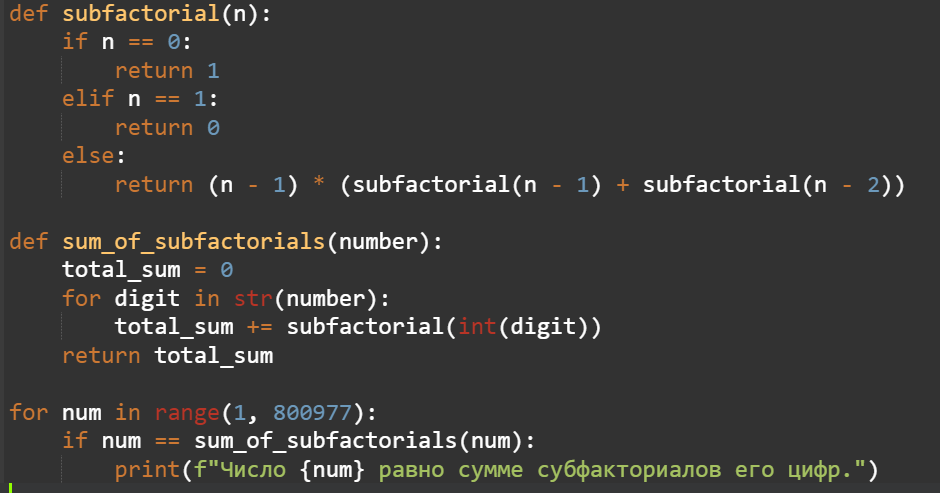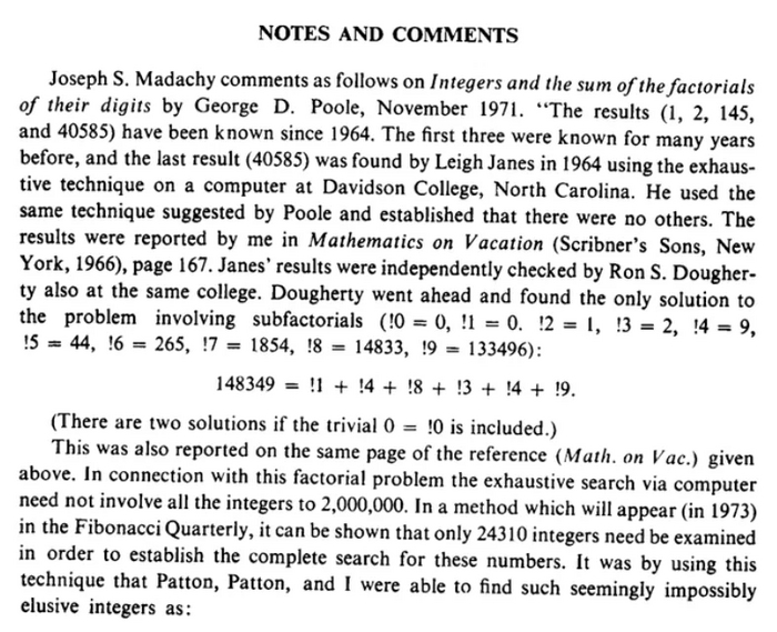 Всё, что больше уже выбывает из статуса кандидата. Т.е. мы установили, что если субфакторион существует, то он максимум состоит из 6 цифр. Затем домножили на 6, по сути рассмотрев число 999999. Конечно, "потолок" можно опустить и пониже, но на скорость это не повлияет