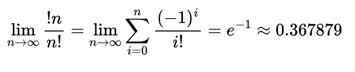 Если внимательно присмотреться к формуле субфакториала, то можно увидеть, что она очень похожа на формулу разложения экспоненты в ряд Тейлора: