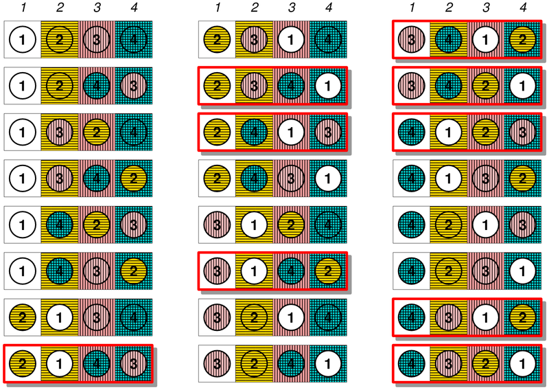Более жизненная интерпретация субфакториала: профессор дал тест 4 студентам – 1, 2, 3 и 4 – и хочет, чтобы они оценили тесты друг друга. Конечно, ни один студент не должен оценивать свой собственный тест. Сколько существует способов, чтобы никто не получил обратно свой собственный тест для проверки?