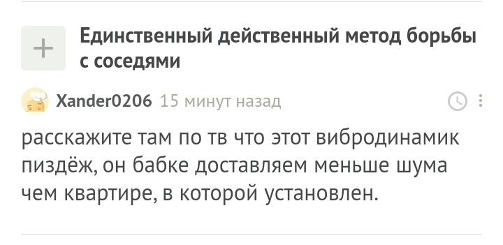 Вызовы полиции не увенчались успехом, но к шуму телевизора добавились стуки по полу. Я понял, что бабка нарочно мне мстит и ничего сделать законного я с ней не смогу. Включать громко музыку это тоже не выход - будут страдать невиновные люди и я принялся изучать интернет, как же воздействовать на соседей особенно сверху. Вы удивитесь, но в интернете есть целый форум, где люди делятся своими советами, как воздействовать на соседей. Вот именно там я и познакомился с чудом китайской технологий - вибро динамик.