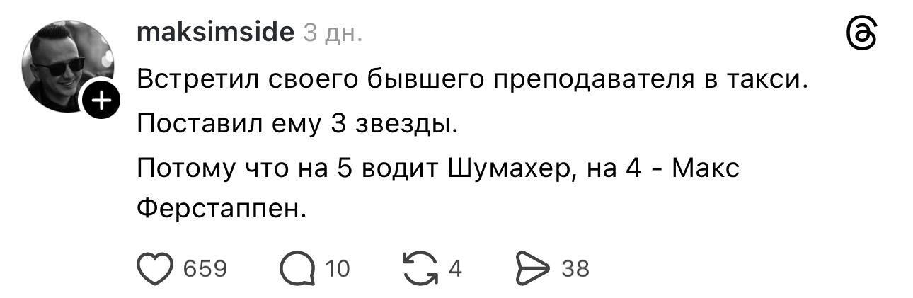 8773 wagonmoi Единственный способ легально отомстить учителю 1 месяц назад Такси Скриншот Таксист Юмор Threads Оценка Преподаватель Формула 1 1.1K 73 18 12 11 6 5 2 1 1 Ещё 5