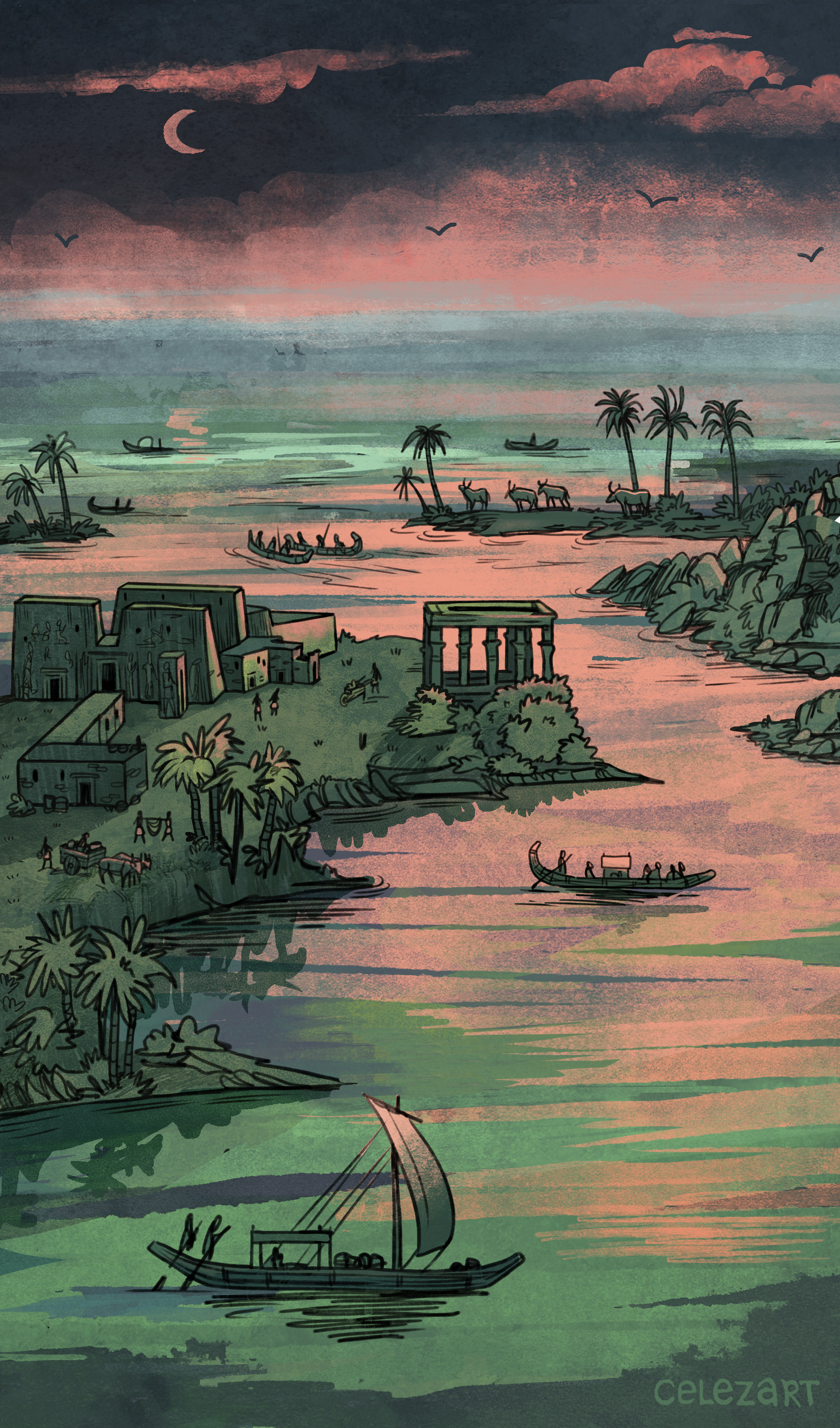 Поучаствовал в грядущем артбуке от ARTMIF, который посвящен египетской мифологии, и для него куча художников нарисовали разные сюжеты из мифов. За основу я взял реальную местность - храм Исиды на Филе, островке посреди Нила, ибо мне захотелось попробовать передать закат на великой древней реке. Вдохновлялся также и японскими гравюрами укиё-э.