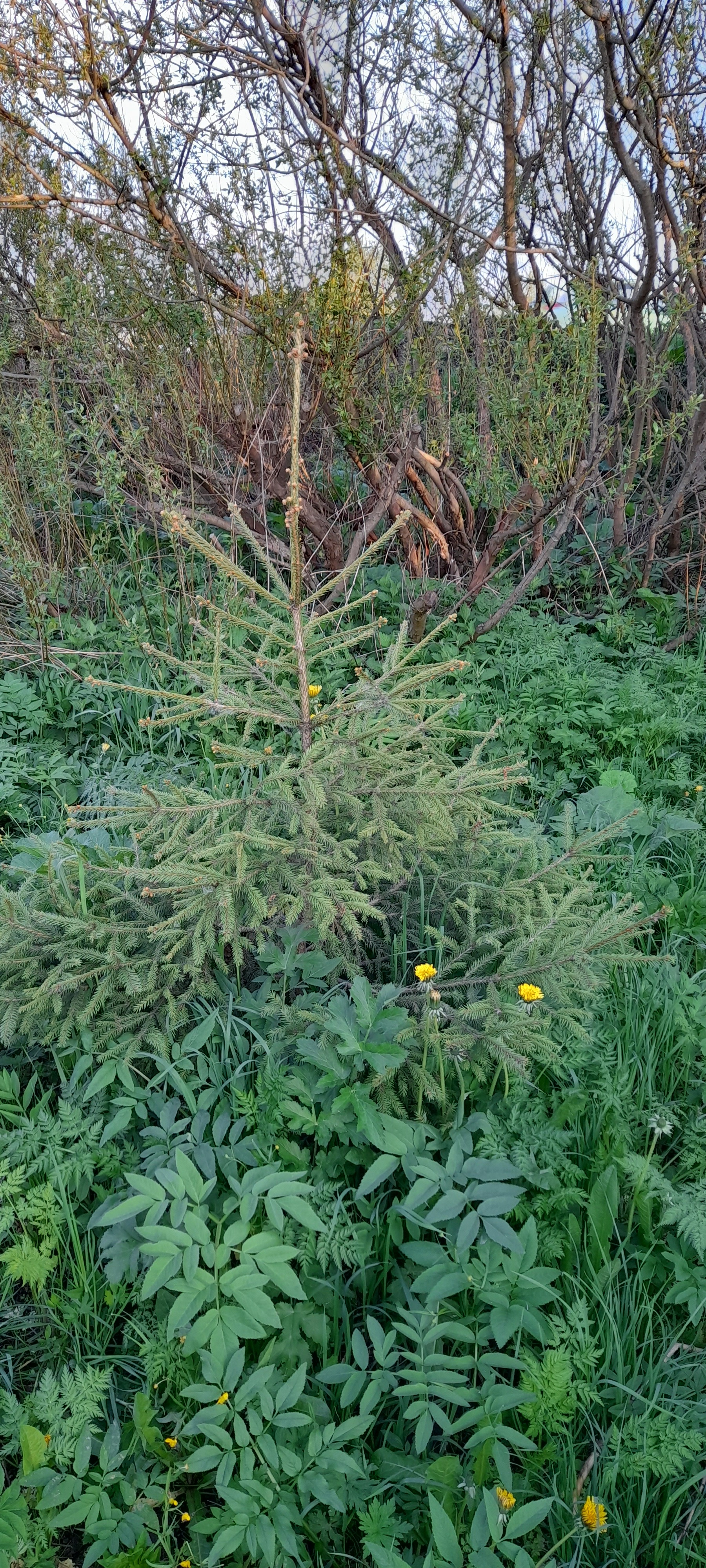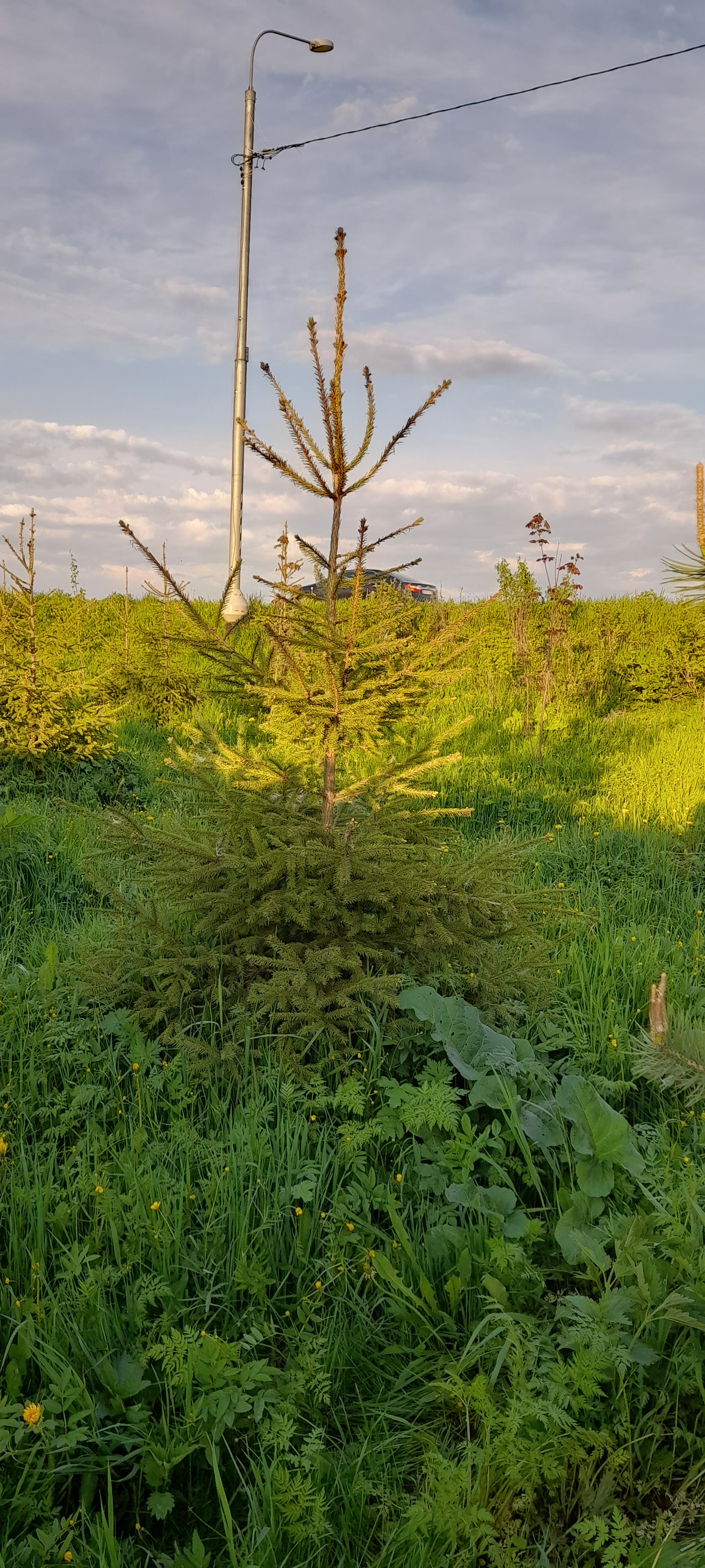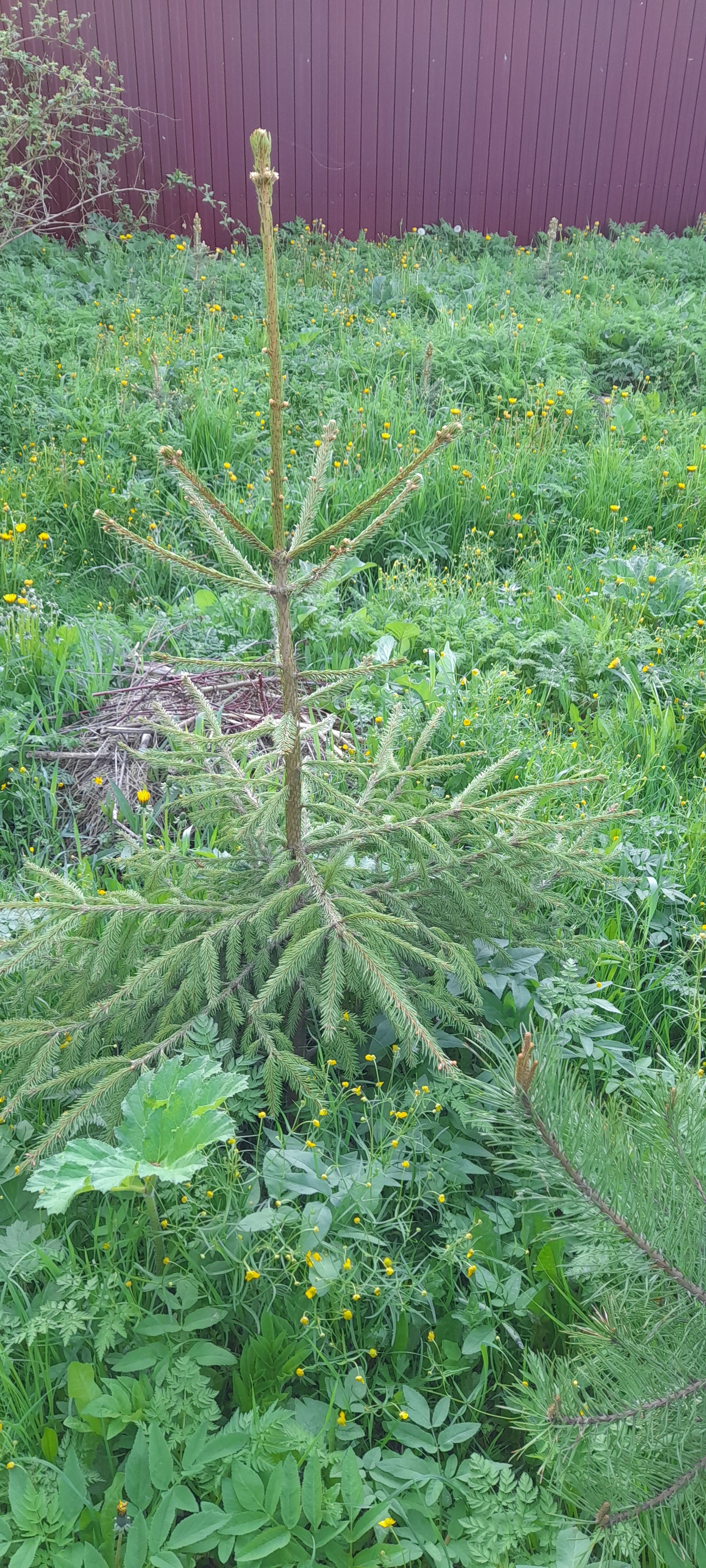 Это другая бедняжка (на фото ниже). На неё года 4 назад наступил чрезвычайно упитанный соседский подросток, он любил ходить туда весной, пускать кораблики в бурлящей канаве, больше просто некому... В результате ёлочка была сломана почти до основания, но, к счастью, осталась одна крупная нижняя ветка, которую я подвязала по возможности вертикально к палке. Теперь ёлочка растёт и хорошеет самостоятельно, хотя и пониже остальных. Уверена, она выровняется постепенно. Вообще, если ёлка сломлена под корень, она от корня не отрастает. Можно выбрасывать и сажать новую.