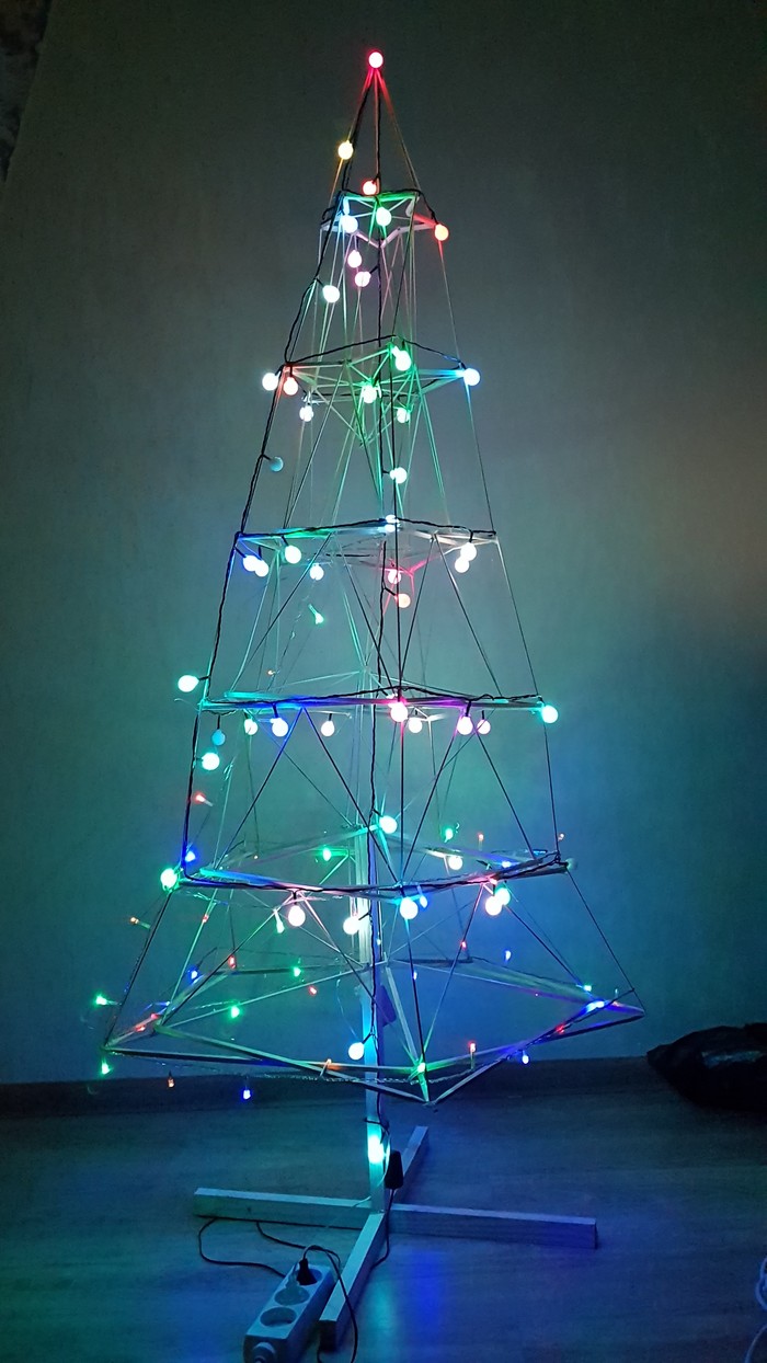 Елка из деревянных шампуров двух видов. Толстые 5мм и тонких 2мм. 3 часа работы и 3 стержня термоклея. + 1 бутылка рома. Делал все на глаз без линейки, елка чуть чуть кривая. Но результатом доволен. Первый раз такую делаю, ничего подобного до этого не видел. Может кому пригодится.