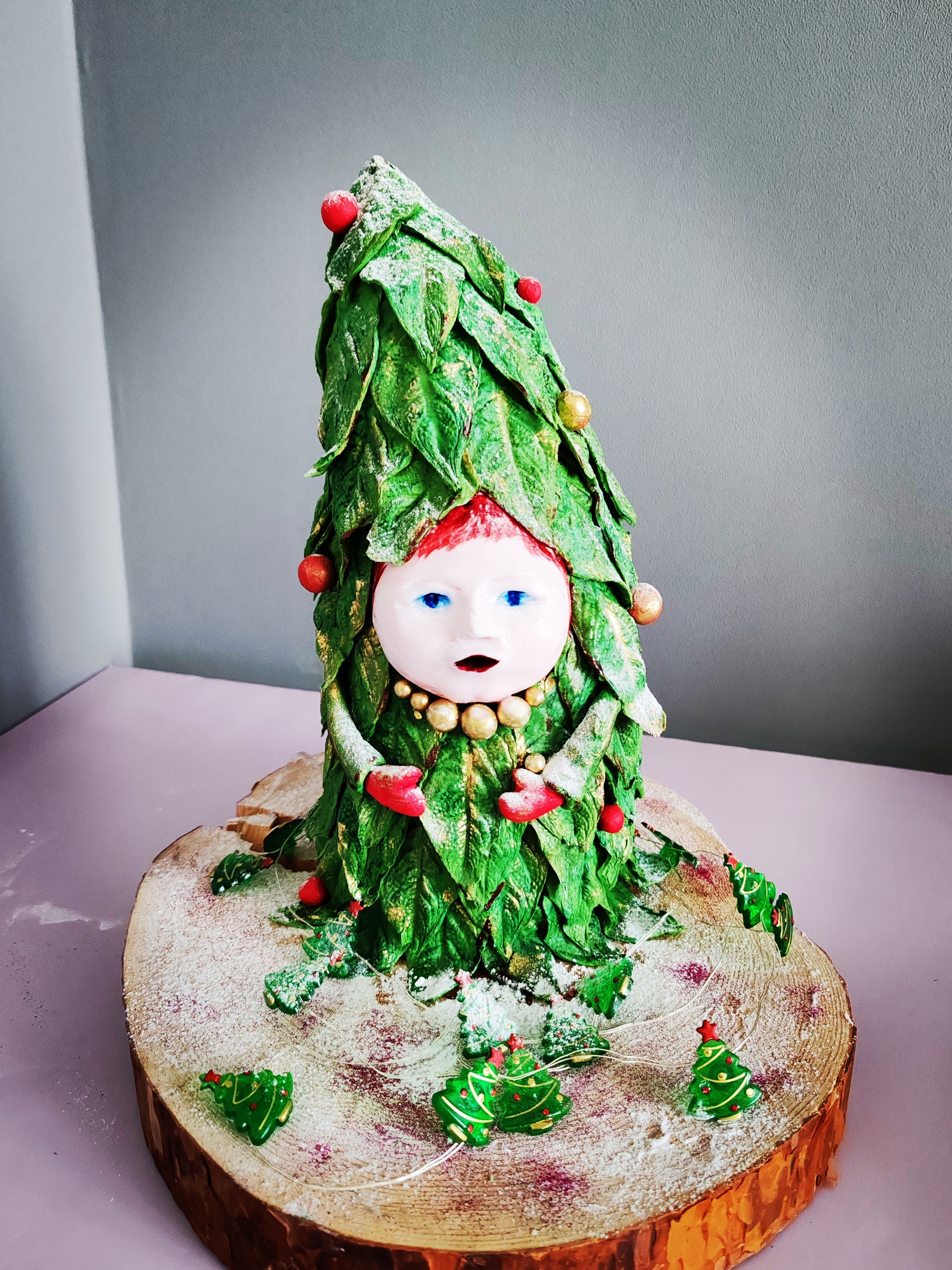 Торт печётся как обычный, но собирается вверх, затем шоколадный ганаш скрепляет всю эту конструкцию и украшается сверху - у меня мастика, а можно и пластичным шоколадом, с ним вкуснее, но и дороже в разы.. Елочка получилась необычная, весёлая и нарядная - украшение стола, я так думаю. (Да вместо иголок - листья, но так и задумано)