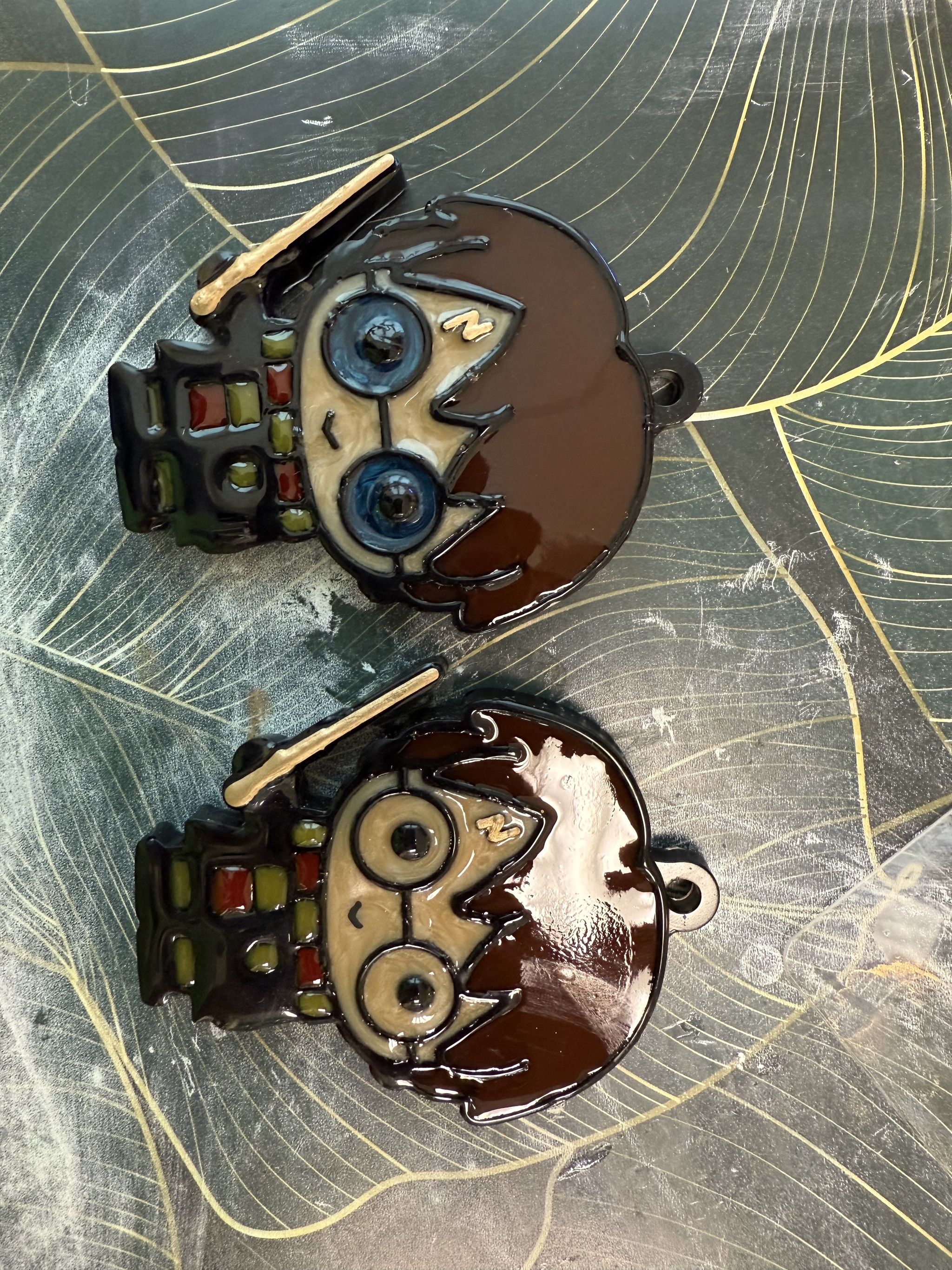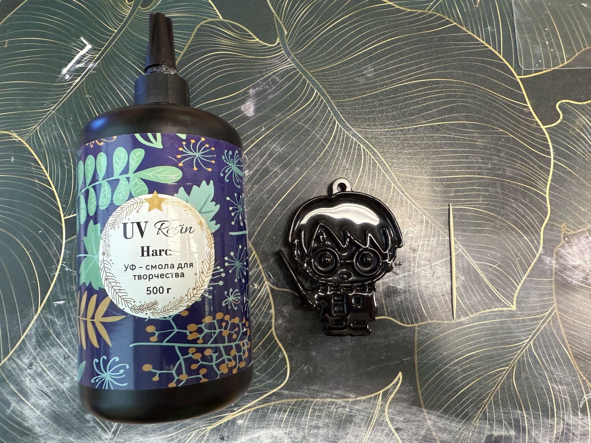 Это сочетание двухкомпонентной и УФ смолы- основу очень удобно заливать и оставлять застывать, а маленькие детали и финишный слой (чтоб блестело сильнее) добавляю по капле с помощью зубочистки, и ставлю в лампу.