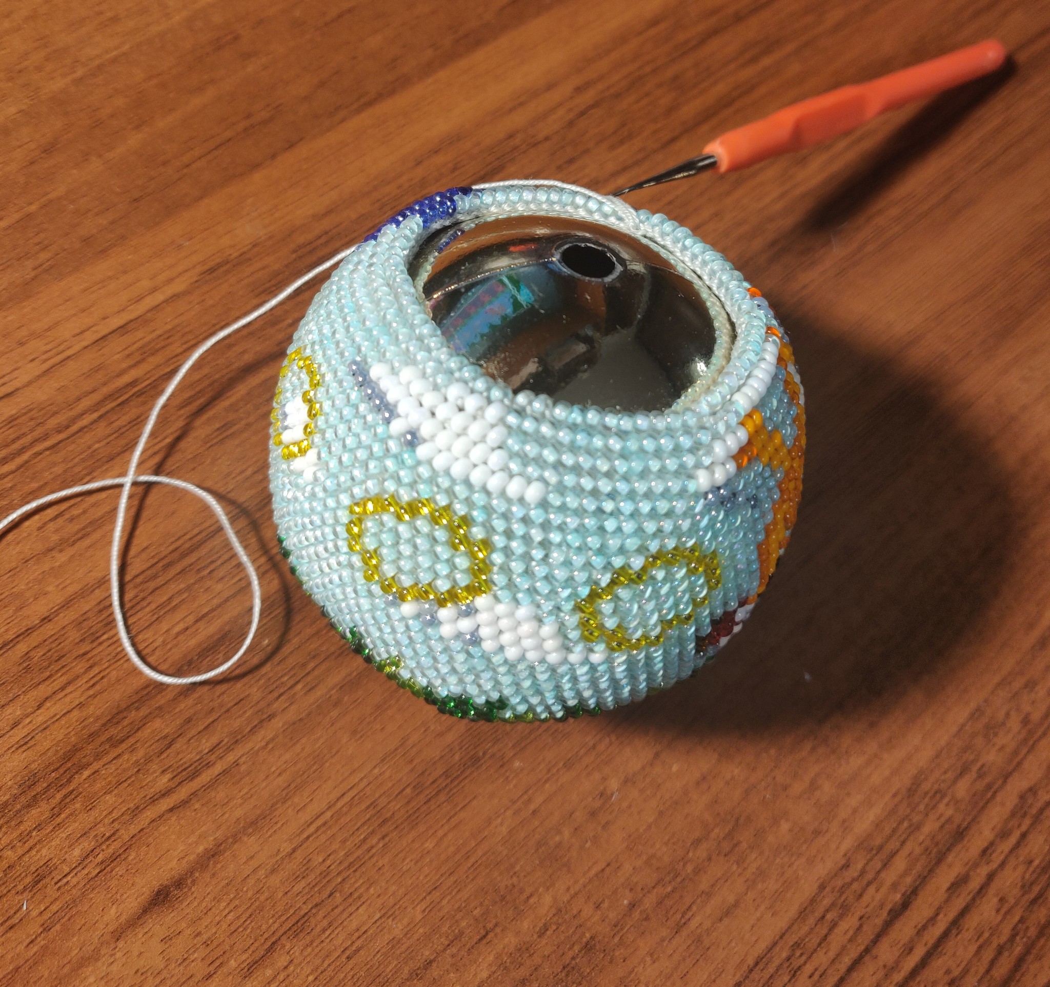 Листаю я тут Пикабушечку, и увидела очень красивые бисерные шарики на ёлку в "Рукодельниках". Я сама ни разу в жизни не вязала, крючка в руках даже не держала. Но неистово загорелась попробовать связать такой же. Насмотрелась мастер-классов, нарисовала схему и побежала в хобби-магазин за необходимым.