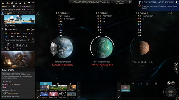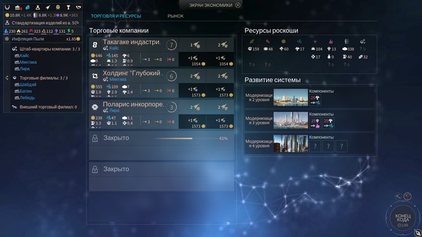 По мере развития откроется возможность выбирать планетам специализацию и строить в системах улучшения за ресурсы роскоши. Можно увеличить приток: золота, науки, трудовых ресурсов, пищи и т.д. Настраиваются улучшения один раз, но в каждой звёздной системе их нужно возводить отдельно, подобно зданиям и кораблям.