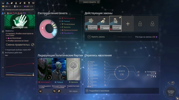 За исключением определённых рас с твердыми предпочтениями, мнение большинства вариативно и, как упоминалось выше, зависит от возводимых в империи построек и кораблей. Казалось бы, хорошо. Строишь фермы, увеличиваешь влияние экологов. Фигачишь всюду лаборатории - учёных. Народ и партия едины! Что продвигаешь, то и получаешь.