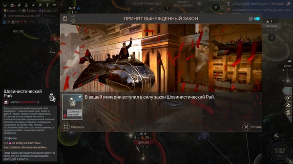 Есть и забавная фишка. Подсмотрев хорошие идеи в цивилизации, разработчики ввели в игру (ещё начиная с серии Endless) чудеса света и легендарные подвиги. Их меньше, чем в цивке, но есть прикольные. В частности, Мировая Клиринговая Палата. Стоит её построить, и мировой рынок привязывается к определённой звездной системе. С каждой торговой сделки в галактике владельцу системы начинает «капать» процентик, и указанный «процентик» можно подкручивать.