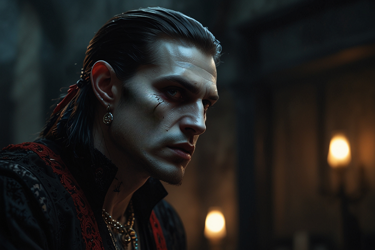 Vimpire lord , aristokrat sharp skiny ear, sharp and elongated features adorned with delicate dangling jewelry, dramatic portrait style reminiscent of greg rutkowski and wlop, intricate lace details, gothic and elegant aesthetic, moody and atmospheric lighting, muted contrasting tones with bold accents of red and black.