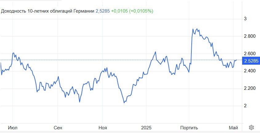 Тем временем доходность 10-летних облигаций Германии вернулась к 2,55%, достигнув самого высокого уровня с 15 апреля, после того как Фридрих Мерц оказался избран канцлером во втором туре парламентского голосования во вторник.