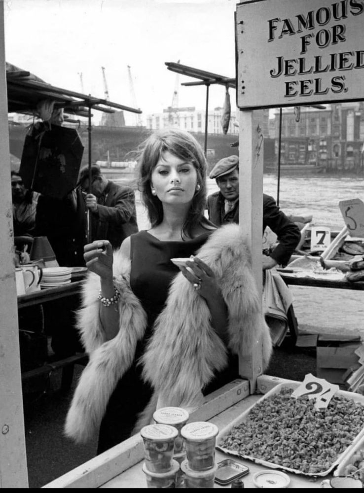 В серый день 1960 года во время съёмок фильма «Миллионерша» Софи Лорен стояла рядом с лотком с желеобразными угрями на южном берегу Темзы.