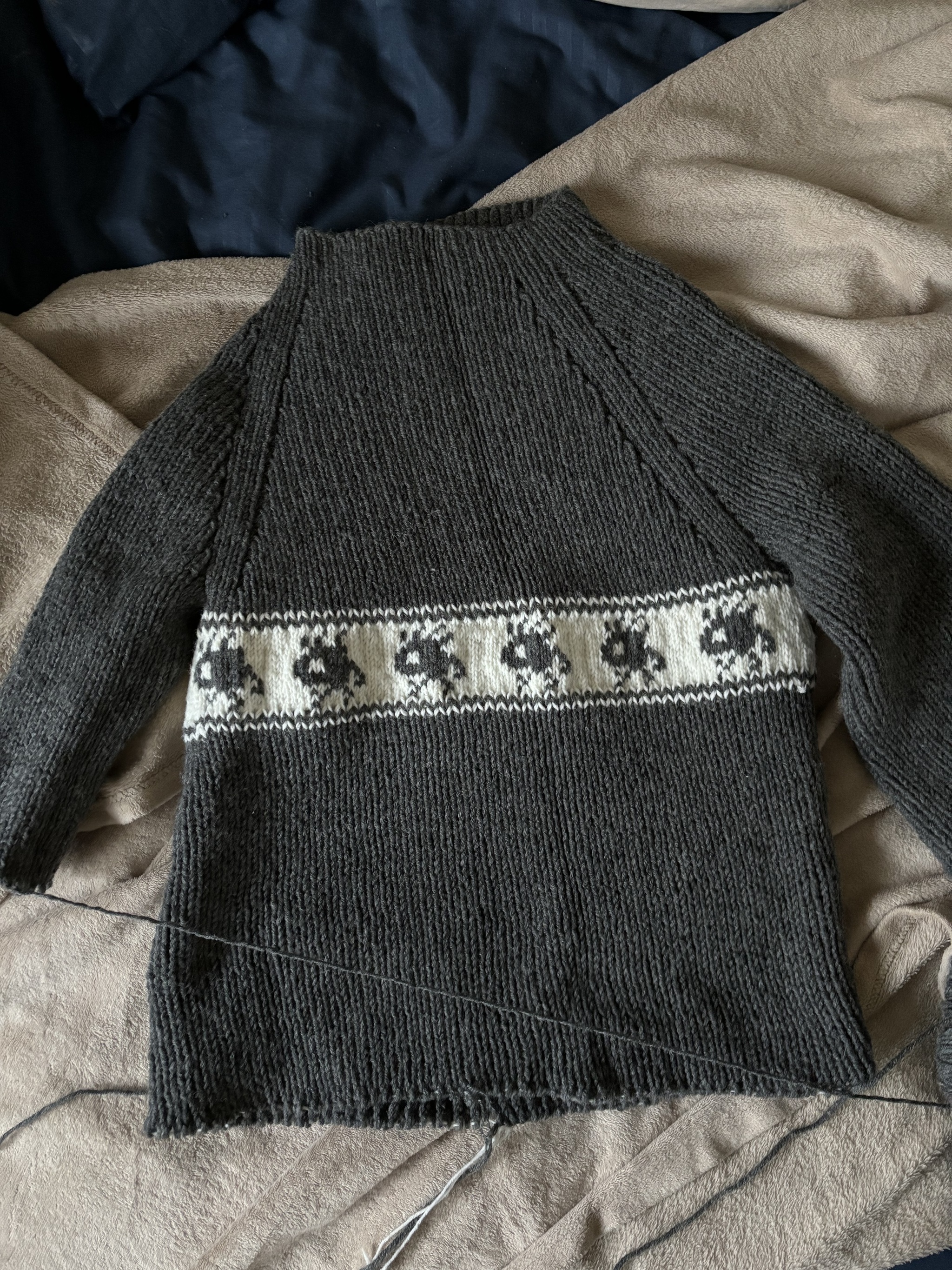 Жертвой снова стал муж. Естественно, ведь всё лучшее - вторым половинкам. Эта попытка кстати была совершена раньше, чем кофта Лебовски, и потому выглядит хуже. Совершенно не представляю, зачем я после того, как задала обхват груди на подростка, продолжила вязать дальше. Видно гордость не позволяла отступить, но после разум взял верх и я всё-таки остановилась - так она и лежит уже несколько лет. Может быть кто-нибудь растолкает меня, и я решусь распустить мурлоков и задать подходящие для взрослого мужчины подмышки и грудь?