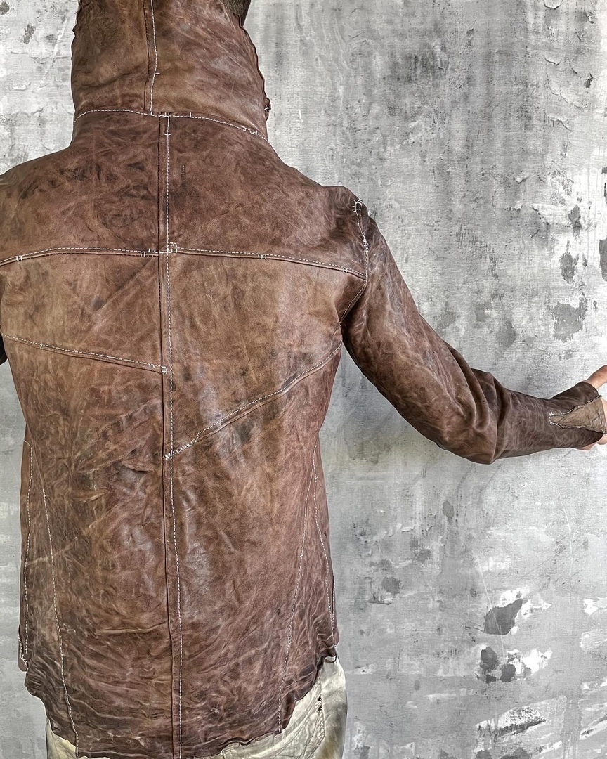 Кожа козы: Настирал, наотбеливал, накрасил, пропитал костынм маслом, после помял. Прошито в основе своей на колонковой машинке с элементами ручного шва местами. курточка по мотивам прошлых двух! Мясная;)