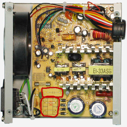 "Что мы здесь видим? Внизу (обведено красным) впаяно две перемычки вместо фильтрующих дросселей (или - предохранителей), а над ними - пустующее посадочное место под конденсаторы той же схемы фильтрации. Производитель сэкономил даже на таком копеечном, но важном элементе, как изолирующая пластиковая прокладка, предохраняющая высоковольтную часть электрической схемы от случайного контакта с кожухом корпуса."