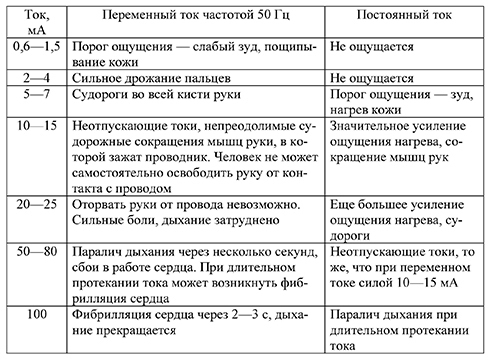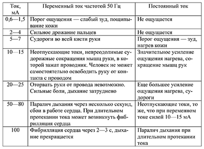 "При переменном токе (50Гц) - начиная от 25 мА - при длительном воздействии (именно поэтому УЗО для защиты человека имеет ток отсечки 10(для влажных помещений) - 30 мА, но не более 100 мА) - может привести к смерти.