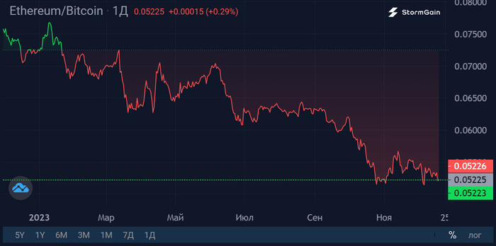 Падение инвестиционной привлекательности для американской аудитории привело к слабости Ethereum по отношению как к другим альткоинам, так и к Bitcoin. В 2023 году он уступает первому номеру на 28%, что обычно характерно для медвежьего рынка.