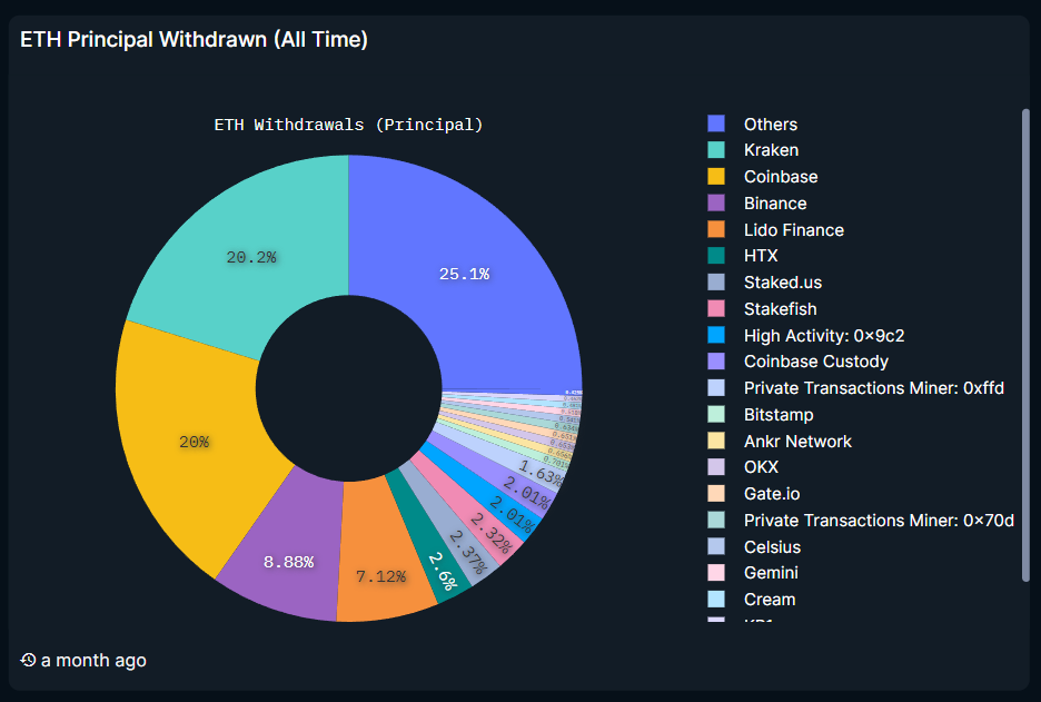 После перехода на PoS вторая по капитализации криптовалюта столкнулась с рядом новых вызовов, ключевым из которых стала активная политика правоприменения SEC. Американские криптобиржи, на долю которых суммарно приходилось свыше трети ETH в стейкинге, получили досудебные претензии. Большинство из них согласилось на сделку, закрыв доступ к программе розничным инвесторам. Так, в общем объеме вывода на совместную долю Kraken и Coinbase приходится 40% или 2 млн ETH (~$4,5 млрд).