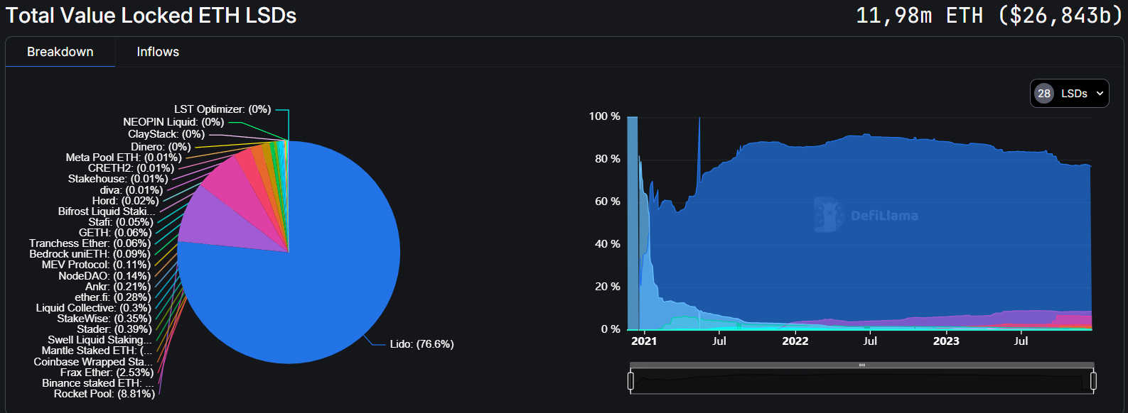 Еще одна проблема, вытекающая из перехода на PoS, заключается в росте централизации сети. На платформу Lido Finance сейчас приходится 32% всех заблокированных средств, а на рынке ликвидных ставок (Liquid Staking Derivatives) она занимает внушительные 77%. Ликвидные ставки – это программа предоставления собственного токена взамен заблокированного ETH. Lido выдает stETH, который свободно котируется на криптовалютном рынке.
