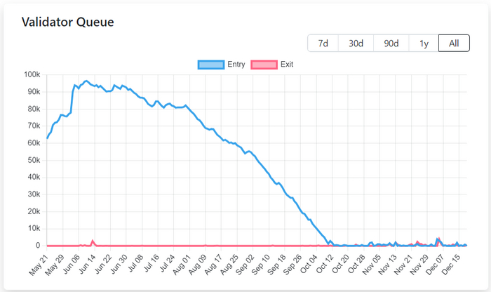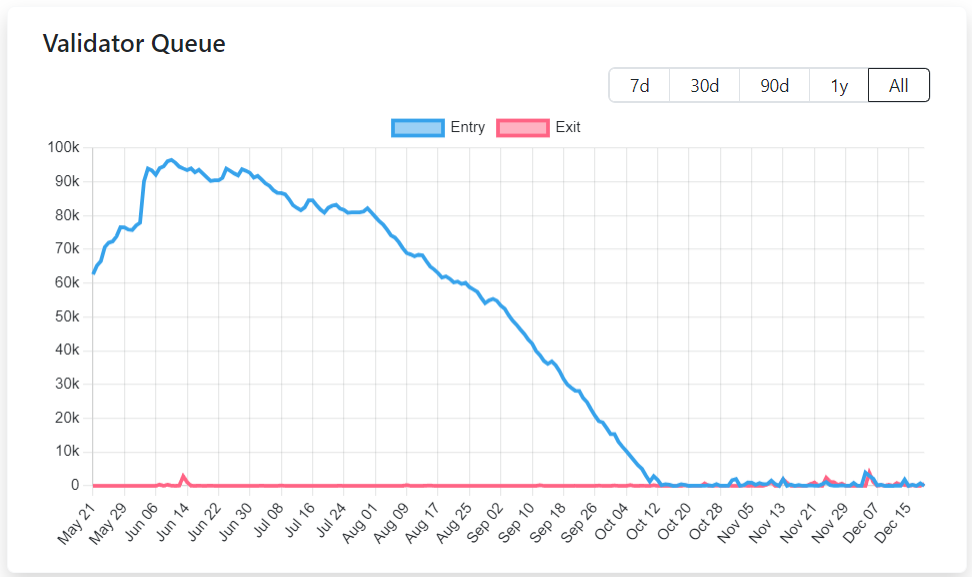 Столь серьезное отставание не могла компенсировать программа стейкинга, где годовая доходность не дотягивает и до 4%. Из-за чего очередь из желающих заблокировать ETH резко сократилась, и теперь время на ожидание подключения составляет менее одного дня.
