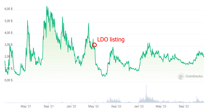 Позавчера в Окружной суд Сан-Франциско был направлен коллективный иск от частных инвесторов LDO против Lido Finance, которые понесли потери из-за политики компании. Претензия сводится к тому, что уже после раздачи LDO разработчикам и ранним институциональным инвесторам, токен выпустили на широкий рынок. За два месяца после листинга на криптобиржах токен обвалился с $3 до $0,6.