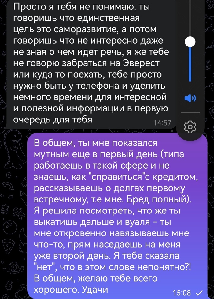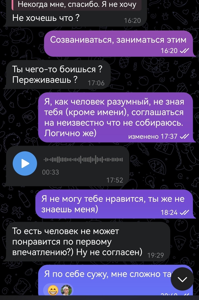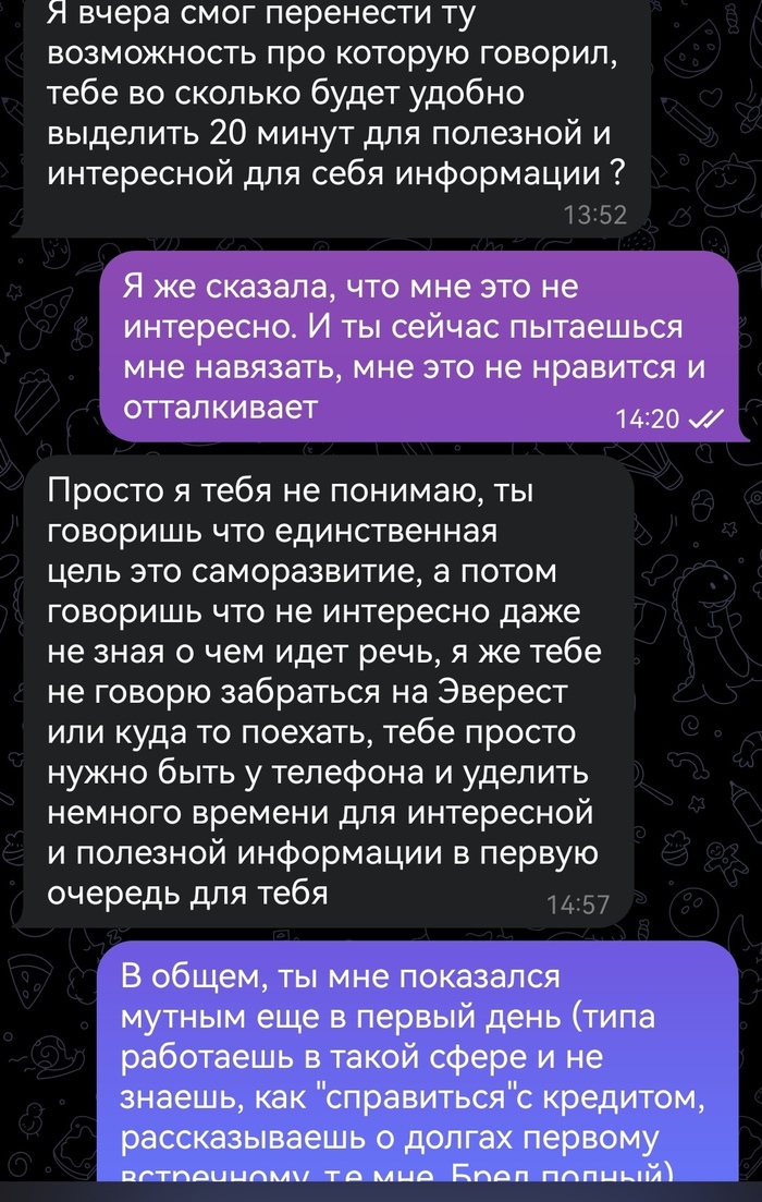 Моя история уже не новость, просто делюсь попыткой развода на сз. Я никогда не любила сайты знакомств, но однажды решилась на такой шаг, зарегалась и через некоторое время попала на такого экземпляра. Из-за такого наглого напора уже понятно, что что-то не так, даже если не разбираешься особо в людях. А я в принципе не склона к сиюминутному доверию, к новым знакомым очень настороженно отношусь. Но довольно предисловий, просто скину скрины (да-да, я додумалась их сохранить:) Час назад прочитала на пикабу про очередной развод и вспомнила, что и мне есть чем поделиться. Кстати, в первый раз у меня просто денег в долг просил какой-то парень и естественно был послан далеко)